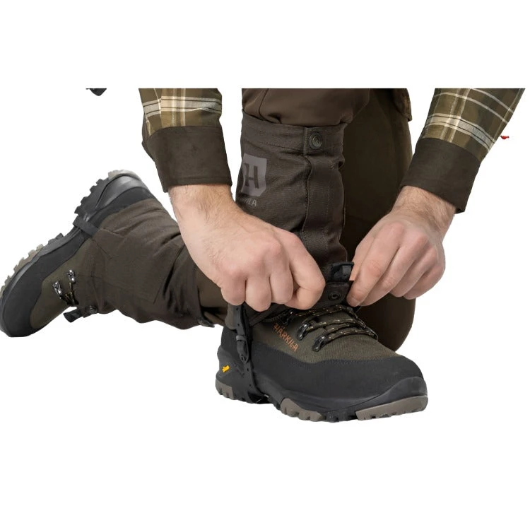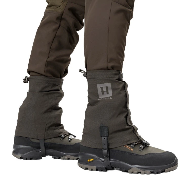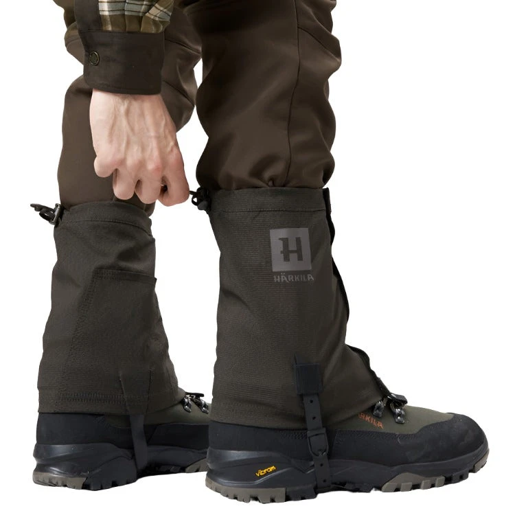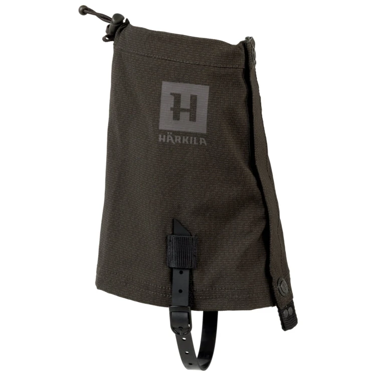 The Harkila Ledge gaiters are made specifically for those who dare to go where the terrain is toughest. Made from a strong nylon/polyester blend, the Ledge gaiters provide protection and make sure to keep unwanted rocks, grit, and gravel out of your boots. The gaiter is stretchy in order to ensure a comfortable fit for many different kinds of boots, and it features a strong hook-and-loop closure at the front placket. The gaiter is adjusted by an elasticated drawstring at the top and it has a shoelace hook to help secure it firmly to the boot.