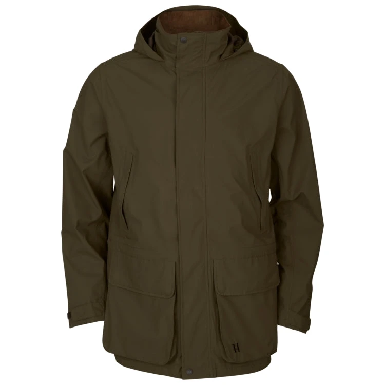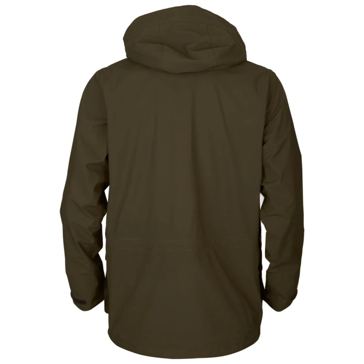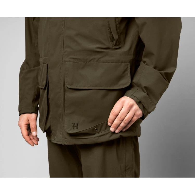 The Harkila Orton Classic Shooting jacket is made from a laminated outer fabric with an HWS® membrane. This makes it windproof and waterproof. For really bad weather, there is a practical, packable hood to keep the rain and strong winds out. The hood is adjustable so as to allow a cap to be worn underneath. There are superb handwarmer pockets, and large front pockets with quick-load straps for holding the flaps open to keep them out the way when reloading while bird shooting. There is also a neat Napoleon pocket and an inner pocket to protect your mobile. The classic fit of the jacket can be adjusted by means of drawstrings at the waist and bottom hem.