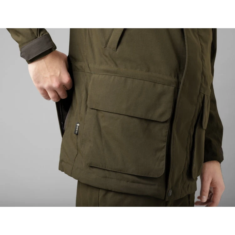 The Harkila Pro Hunter Shooting GTX jacket takes all of the tried and tested features of the iconic Pro Hunter range and put them to good use in this shooting jacket. Made from the highly durable and hardwearing Airtech® fabric, the Pro Hunter Shooting jacket is great for rough terrain and dense forest which works well for beaters and shooters in situations where a full tweed suit might be too classic. The jacket has a wind- and waterproof GORE-TEX membrane that will keep you dry during wet days. The shooting jacket has a classic cut that is a bit different from our other Pro Hunter styles to make it fit in perfectly on a classic shooting day. It has an detachable hood, adjustable cuffs as well as handwarmer pockets.