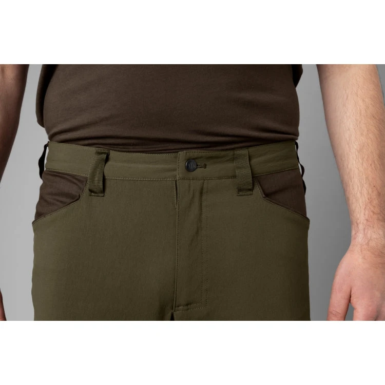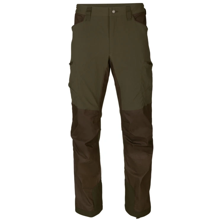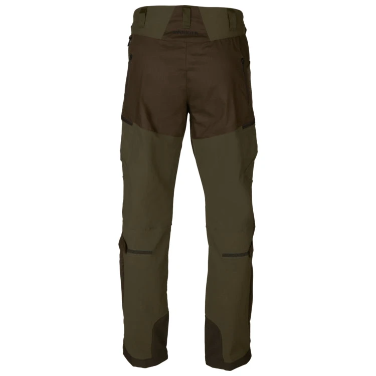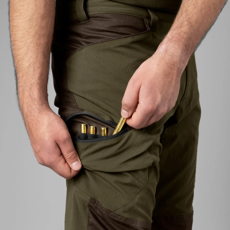 The Harkila Ragnar trousers are made from 96% nylon and 4% spandex, making them supple and stretchable. They do not have a membrane, but are DWR (Durable Water Repellent) treated. This makes the trousers dirt- and water-repellent because the water pearls up on the surface of the fabric and drips off or evaporates instead of soaking in. The trousers have ventilation zips on the back of the thighs and on the legs, and the vents have netting to prevent anything undesirable making its way in when they are open. The Ragnar trousers have two front pockets. The two thigh pockets have zips to keep their contents safe during intense activity. The right thigh pocket contains a cartridge holder for four rifle cartridges. The Ragnar trousers are reinforced with extra robust fabric at the ankles, with a press-stud adjustment strap to allow a close fit. They also have adjustment straps behind the knees and a D-ring on the left of the waistband for attaching various items of equipment.