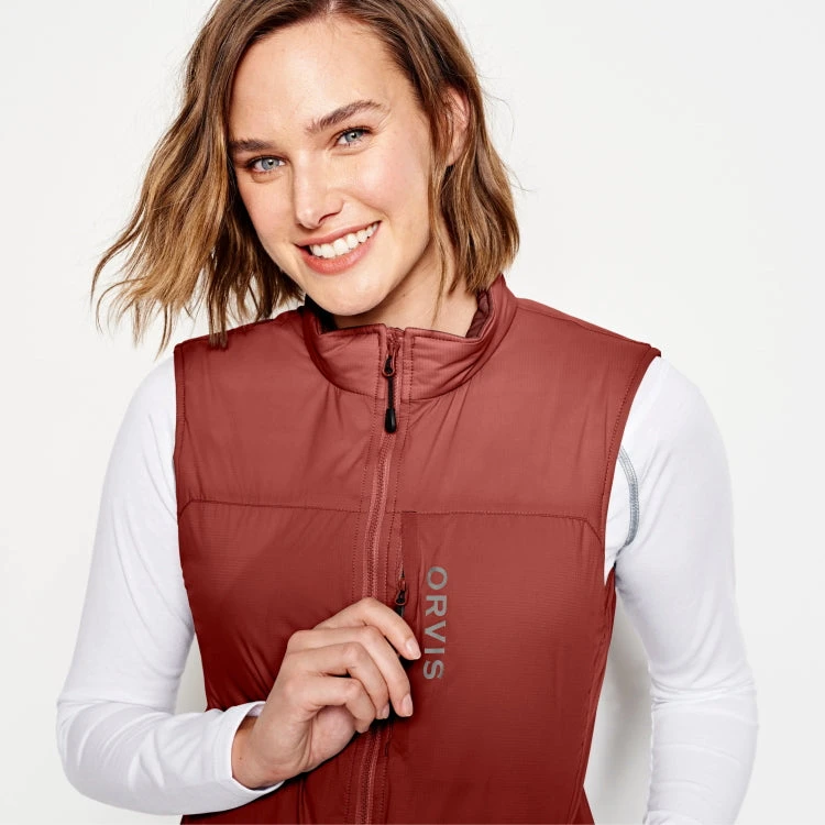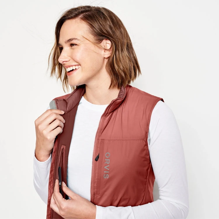 The Orvis Ladies Pro Insulated Gilet is contoured to fit the female angler and uses body-mapped insulation to provide optimal temperature control through a wide range of activity levels and environments. 80g PrimaLoft® Gold Active insulation (45% recycled content) protects the body’s core, with weightless, highly-packable warmth ideal for active pursuits. Polartec® Alpha® (80g) (55% recycled content), originally designed for Special-Ops teams, regulates body heat and moisture through the side panels allowing the gilet to be comfortably worn through a wide range of temperatures and activities. The outer is a 20D mechanical stretch ripstop nylon shell with unique coating to improve wind and weather resistance. Featuring zippered, fleece-lined hand-warmer pockets, zippered chest pocket for storage and internal zippered security pocket that doubles as a stuff sack.