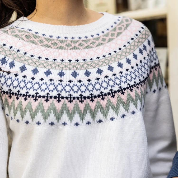The Schoffel Ladies Fairisle Jumper is crafted with a cotton mix fabric and features a beautiful fairisle design, an ideal layering piece for your seasonal wardrobe.
