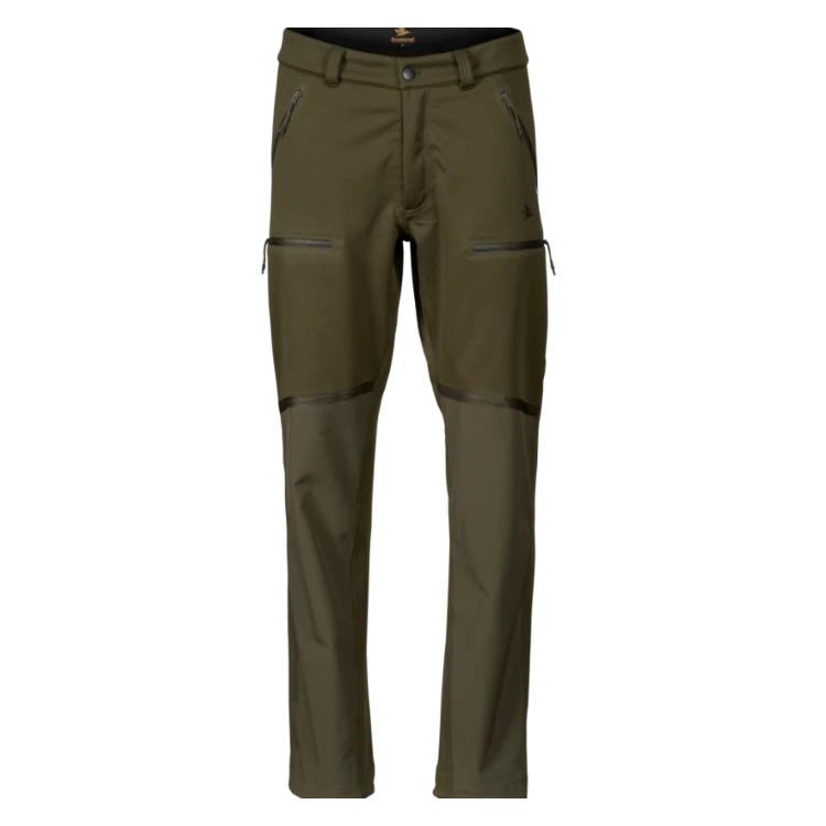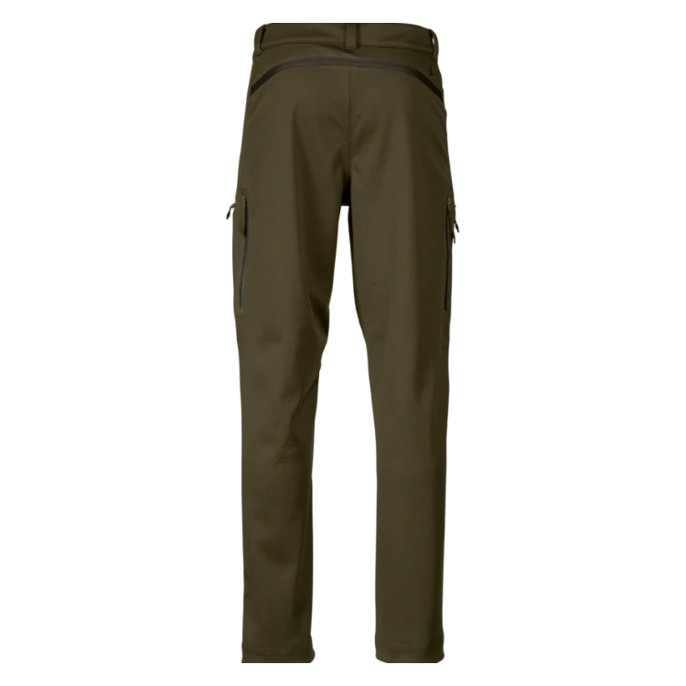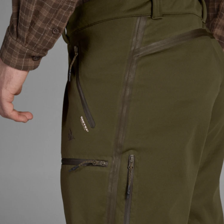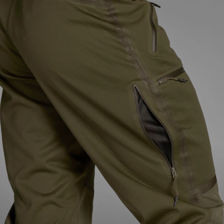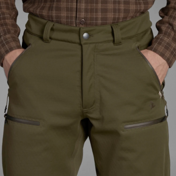 The Seeland Hawker Advance trousers are technical shell trousers designed for the shooter who is not afraid of difficult terrain and bad weather. They are for the shooter who is looking for breathable, lightweight, low-noise trousers that are suitable for all kinds of active stalking. Hawker Advance trousers feature a windproof and waterproof membrane, and reinforced seams that are taped inside and out. There is extra reinforcement from the knees down to the ankles, and both the fabric of the trousers and the membrane are stretchy ensuring comfort, freedom of movement and removing any worry about stalking through the undergrowth or on steep slopes. Inside, the trousers are lined with soft, honeycombed polyester. The honeycomb structure allows air and moisture to circulate and disperse and evaporate more quickly making the trousers highly breathable and temperature-regulating. If you get too hot, you can ventilate by unzipping behind the knees. The four pockets have waterproof zips and the ankle openings have an elasticated drawstring, tucked inside the leg so as to avoid catching on twigs or similar. The combination of Hawker Advance jacket and trousers makes for a highly versatile shell suit for all kinds of active stalking, whatever the weather or ground conditions.